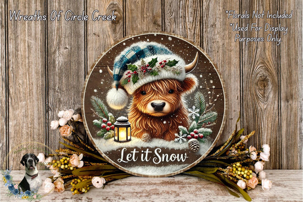 Let It Snow Wreath Sign | Highland Cow with Lantern & Teal Plaid Hat | Lightweight Round Metal Wreath Sign | No Holes | Rustic Winter Decor