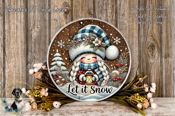 Let It Snow Wreath Sign | Winter Girl with Lantern & Teal Plaid Hat | Lightweight Round Metal Wreath Sign | No Holes | Rustic Holiday Decor