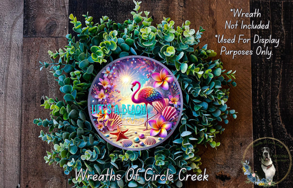 Life’s a Beach Flamingo Sign | Tropical Summer | Lightweight Round Metal Wreath Sign | No Holes in Sign | Beach House Decor