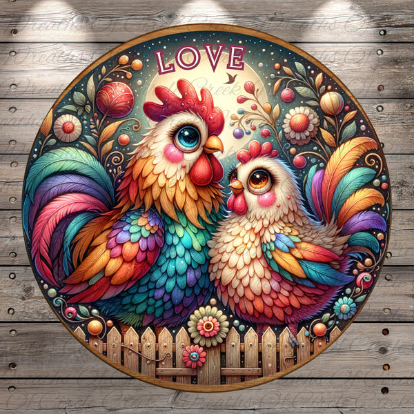 Love Chickens Moonlight Farmhouse Valentine Aluminum Metal Wreath Sign (Lightweight, No Holes)