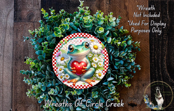 Love Frog Valentine | Cute Frog Holding Heart | Lightweight Round Metal Wreath Sign | No Holes in Sign