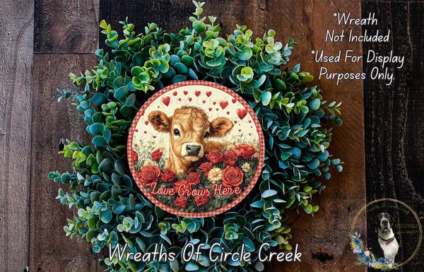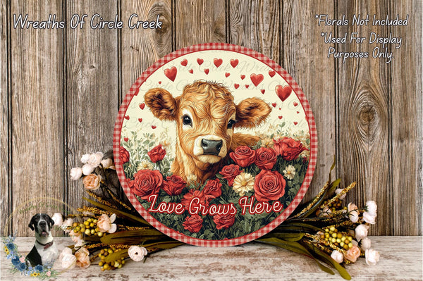 Love Grows Here Wreath Sign | Cow with Roses & Hearts Farmhouse Design | Lightweight Round Metal Wreath Sign | No Holes | Rustic Country