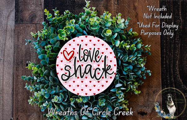 Love Shack Valentine Sign | Pink Heart Pattern Decor | Lightweight Round Metal Wreath Sign | No Holes in Sign | Fun Retro Love Decor