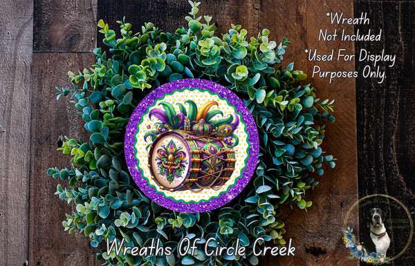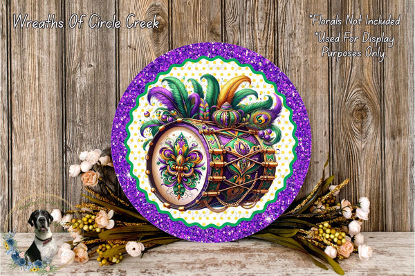 Mardi Gras Drum | Fleur de Lis Feather Decor | Lightweight Round Metal Wreath Sign | No Holes in Sign | Carnival Parade Sign