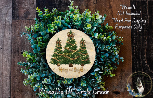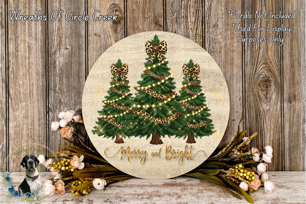 Merry and Bright Leopard Ribbon Christmas Trees | Gold Holiday | Lightweight Round Metal Wreath Sign | No Holes in Sign | Glam Christmas