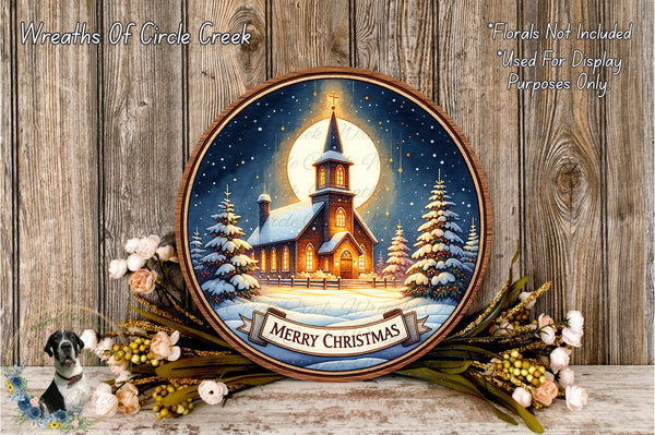 Merry Christmas Church | Peaceful Winter Night Decor | Lightweight Round Metal Wreath Sign | No Holes in Sign | Holiday Sign