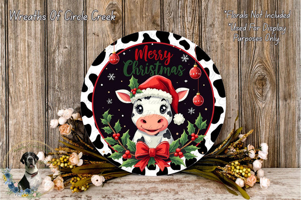 Merry Christmas Cow Sign | Lightweight Round Metal Wreath Sign | No Holes in Sign | Farmhouse Holiday Decor