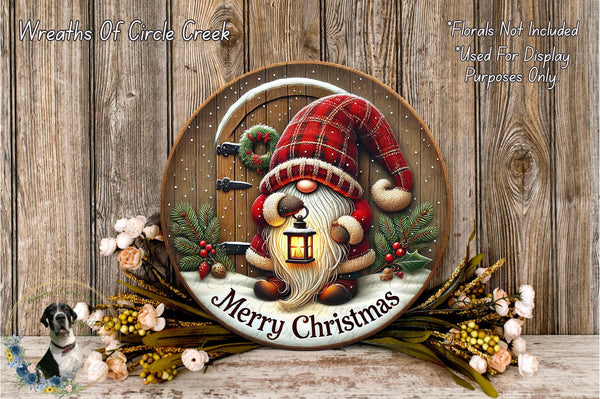 Merry Christmas Gnome Sign | Rustic Holiday Farmhouse Decor | Lightweight Round Metal Wreath Sign | No Holes in Sign | Winter Lantern Style