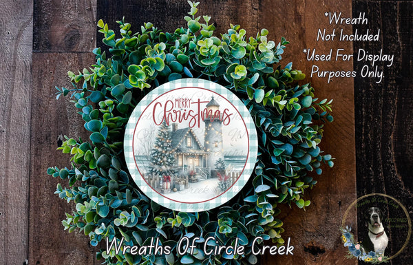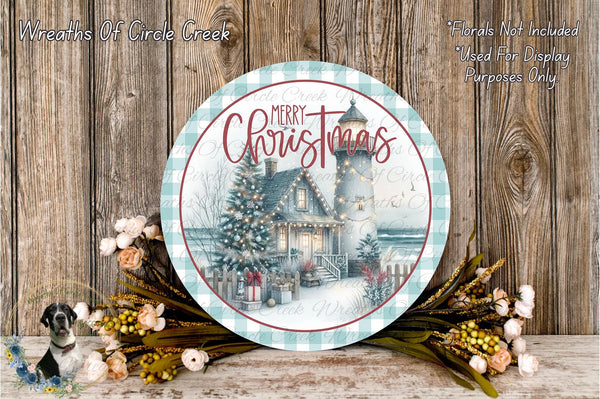 Merry Christmas Lighthouse Wreath Sign | Lightweight Round Metal Wreath Sign | No Holes in Sign | Coastal Holiday Door Decor