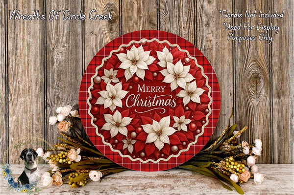 Merry Christmas Wreath Sign | White Poinsettias with Red Plaid Border | Lightweight Round Metal Wreath Sign | No Holes | Holiday Decor