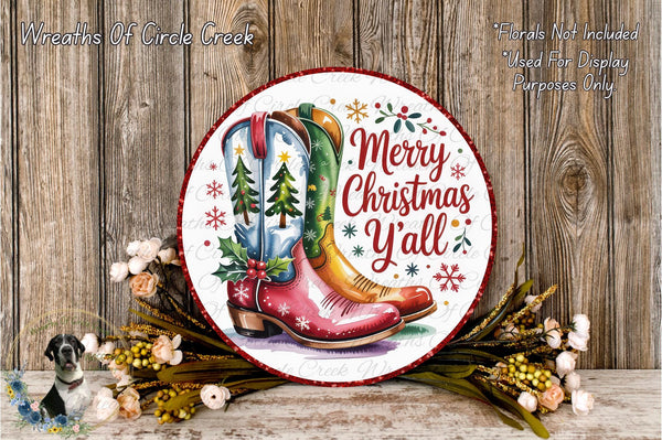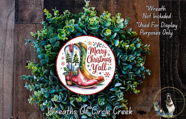 Merry Christmas Y’all | Cowboy Boots Western Holiday Decor | Lightweight Round Metal Wreath Sign | No Holes in Sign | Country Christmas