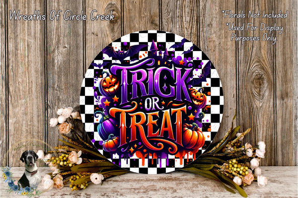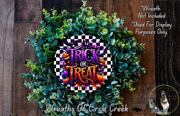 Neon Trick or Treat Sign | Lightweight Round Metal Wreath Sign | No Holes in Sign | Halloween Purple Pumpkin Decor