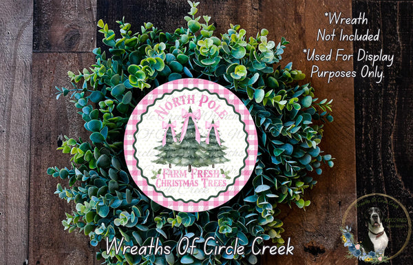North Pole Farm Fresh Christmas Trees | Pink Buffalo Plaid | Lightweight Round Metal Wreath Sign | No Holes in Sign | Farmhouse Christmas