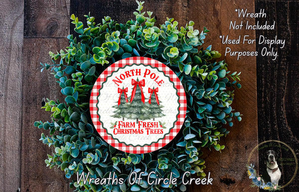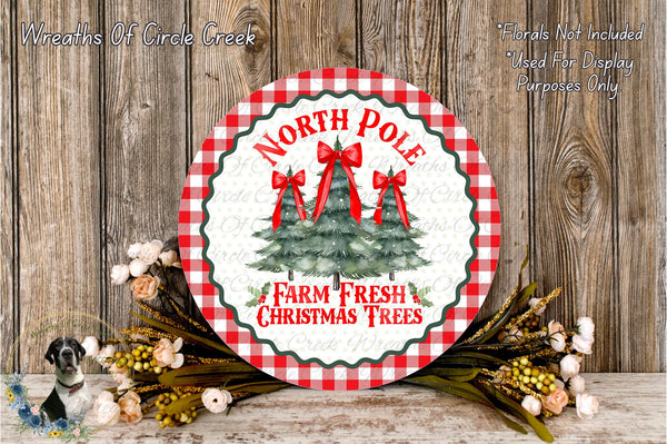 North Pole Farm Fresh Christmas Trees | Red Buffalo Plaid | Lightweight Round Metal Wreath Sign | No Holes in Sign | Rustic Christmas