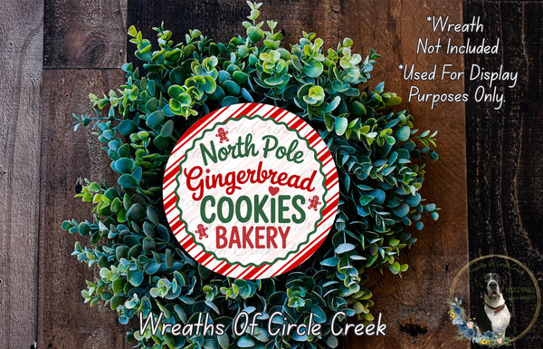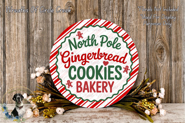 North Pole Gingerbread Cookies Bakery | Red White Candy Stripe | Lightweight Round Metal Wreath Sign | No Holes in Sign | Christmas Kitchen