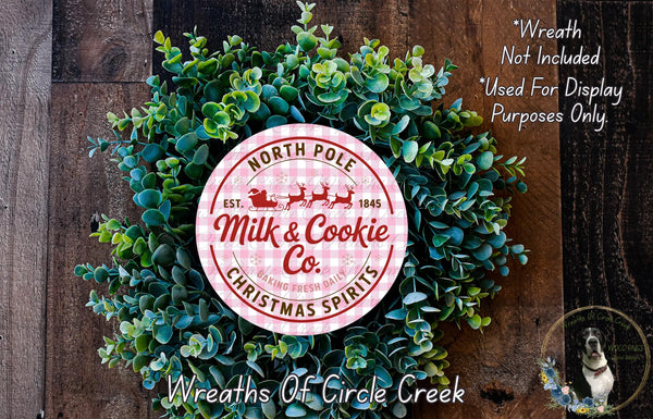North Pole Milk & Cookie Co. | Pink Buffalo Plaid Christmas Decor | Lightweight Round Metal Wreath Sign | No Holes in Sign | Holiday Kitchen