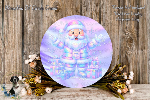 Pastel Holographic Santa | Iridescent Christmas Decor | Lightweight Round Metal Wreath Sign | No Holes in Sign | Whimsical Holiday Sign