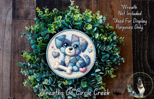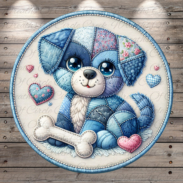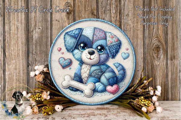 Patchwork Puppy Blue Denim Aluminum Metal Wreath Sign (Lightweight, No Holes)