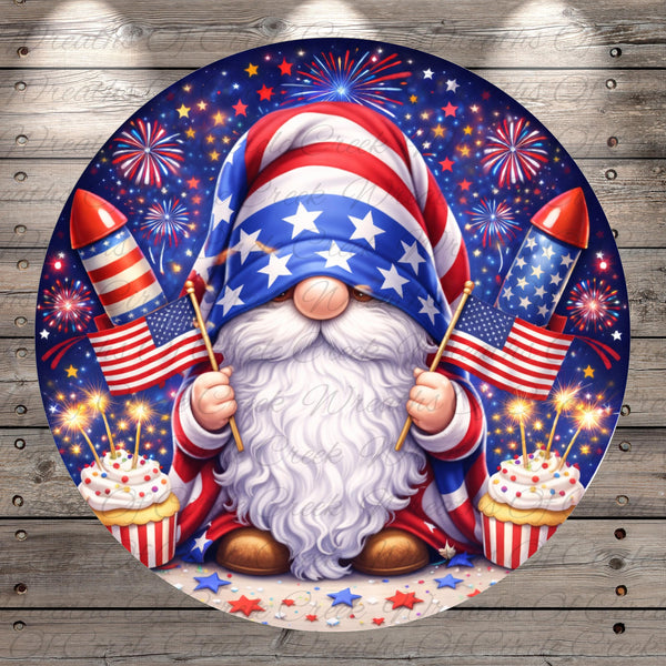 Patriotic Gnome Fireworks American Flag Aluminum Metal Wreath Sign (Lightweight, No Holes)