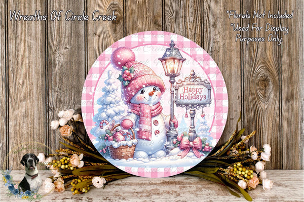 Pink Snowman Happy Holidays Wreath Sign | Pink Plaid Christmas Sign | Round Metal Wreath Sign | No Holes | Winter Holiday Decor