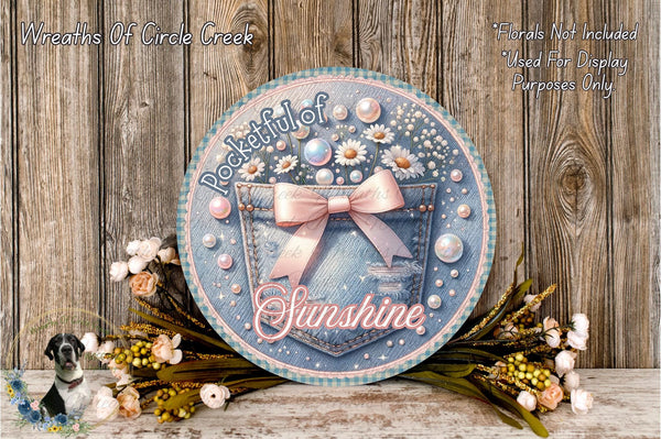 Pocketful of Sunshine Wreath Sign | Denim Pocket with Daisies & Pearls | Lightweight Round Metal Wreath Sign | No Holes | Country Chic Decor
