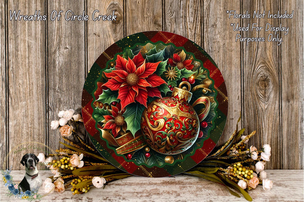 Poinsettia Ornament Christmas | Elegant Red and Gold Holiday | Lightweight Round Metal Wreath Sign | No Holes in Sign | Classic Christmas