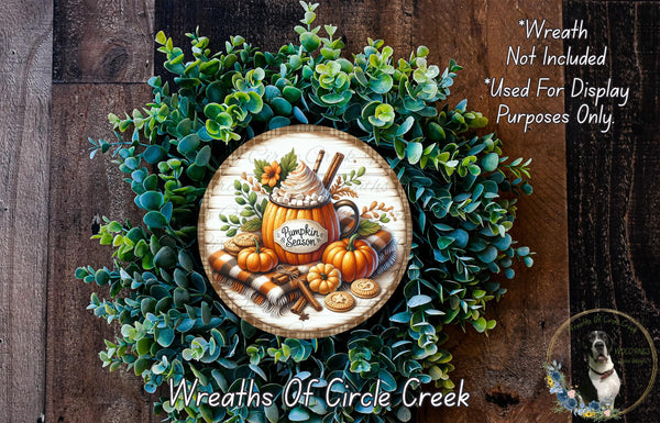 Pumpkin Season Mug Sign | Lightweight Round Metal Wreath Sign | No Holes in Sign | Fall Coffee Decor