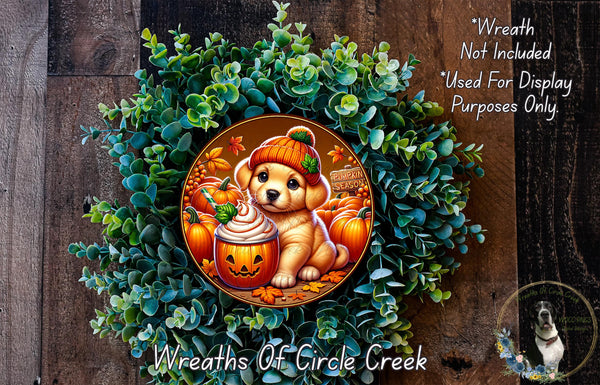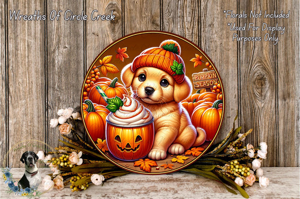 Pumpkin Season Puppy Sign | Lightweight Round Metal Wreath Sign | No Holes in Sign | Fall Dog Decor