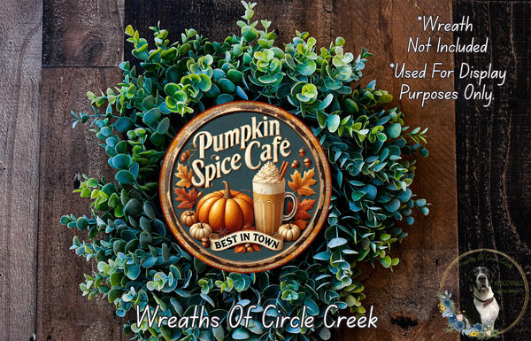 Pumpkin Spice Cafe Sign | Lightweight Round Metal Wreath Sign | No Holes in Sign | Fall Coffee Decor