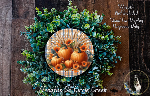 Pumpkin Sunflower Plaid Sign | Lightweight Round Metal Wreath Sign | No Holes in Sign | Fall Farmhouse Decor