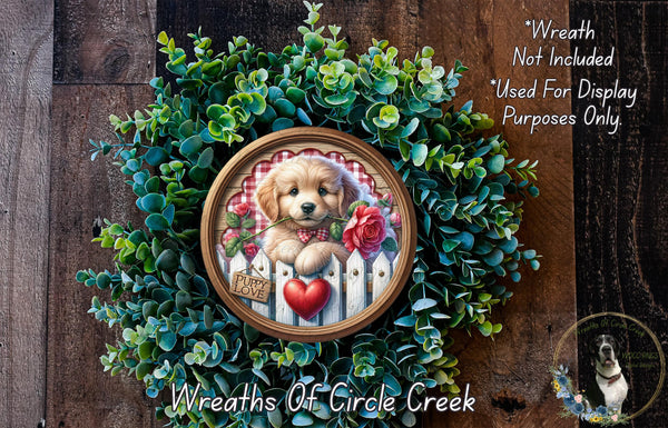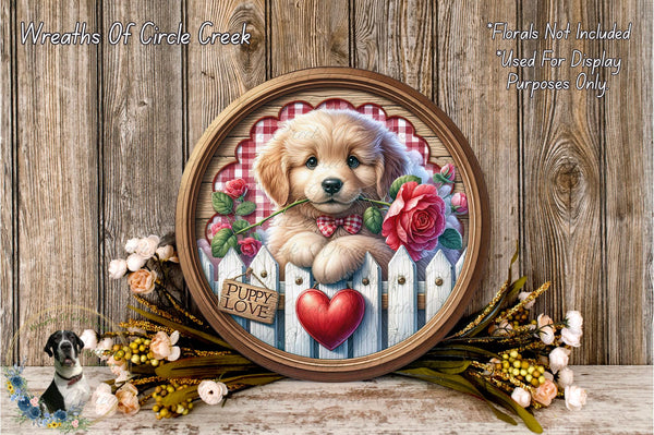 Puppy Love Valentine Sign | Gingham Rose Heart Decor | Lightweight Round Metal Wreath Sign | No Holes in Sign | Farmhouse Dog Style