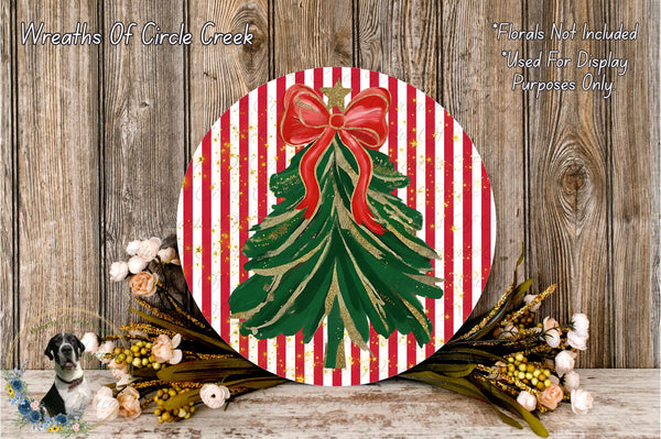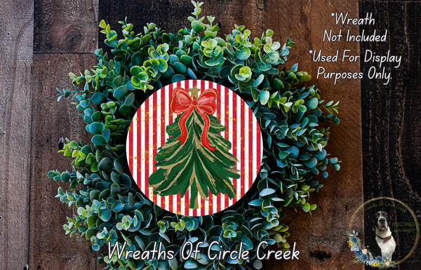 Red Bow Christmas Tree | Candy Stripe Holiday Decor | Lightweight Round Metal Wreath Sign | No Holes in Sign | Festive Red and Gold Sign