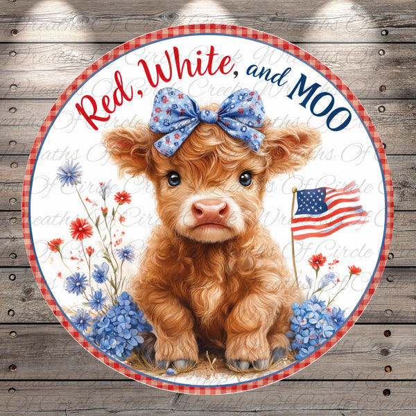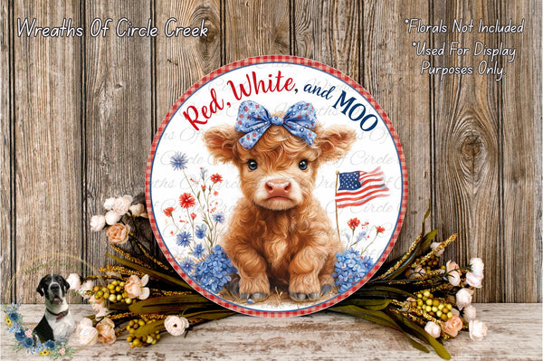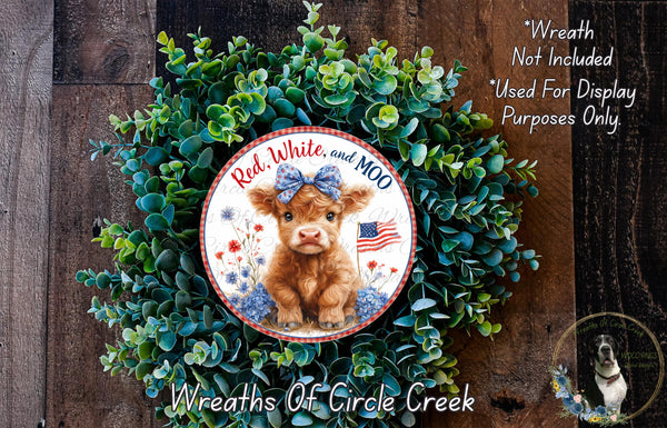 Red White and Moo Highland Cow Patriotic Sign Cute Americana Farmhouse Aluminum Metal Wreath Sign (Lightweight, No Holes)