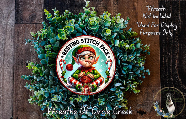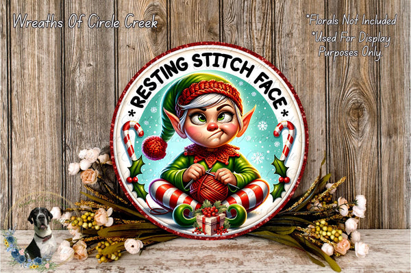 Resting Stitch Face Elf Sign | Funny Christmas Elf Decor | Lightweight Round Metal Wreath Sign | No Holes in Sign | Holiday Yarn Gift Sign