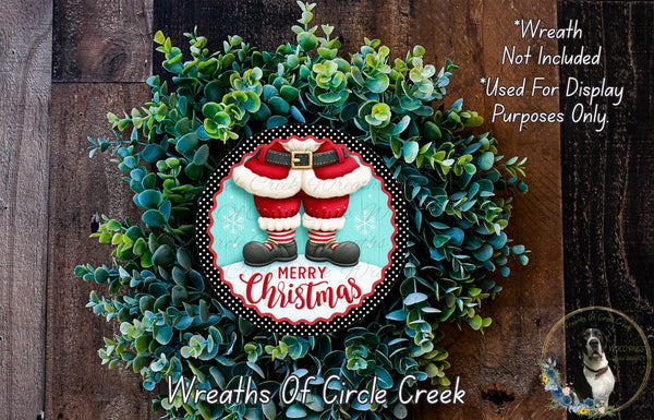 Santa Legs Merry Christmas | Red and Aqua Holiday Decor | Lightweight Round Metal Wreath Sign | No Holes in Sign | Polka Dot Christmas Sign