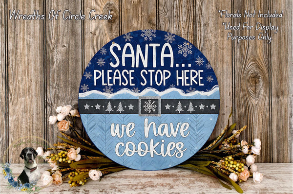 Santa Please Stop Here Sign | Blue Christmas Cookie Decor | Lightweight Round Metal Wreath Sign | No Holes in Sign | Holiday Door Sign