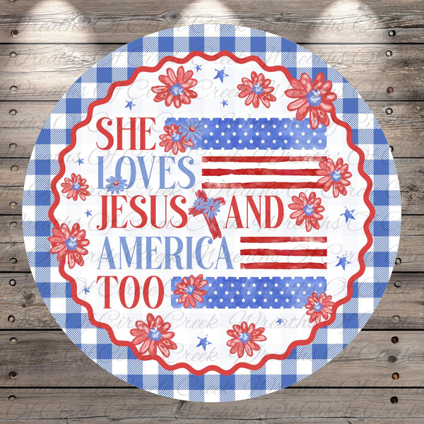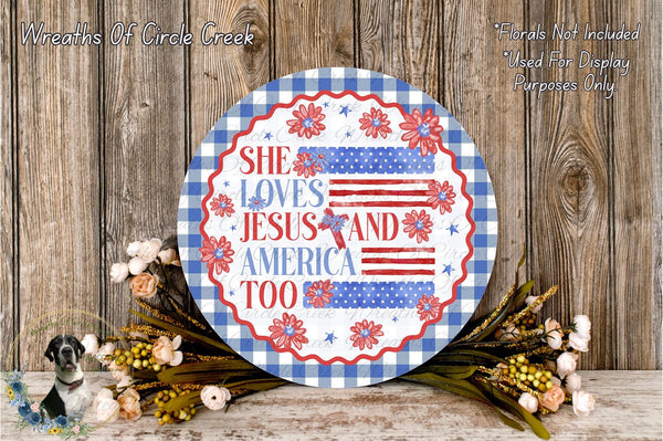 She Loves Jesus and America Too Patriotic Aluminum Metal Wreath Sign (Lightweight, No Holes)