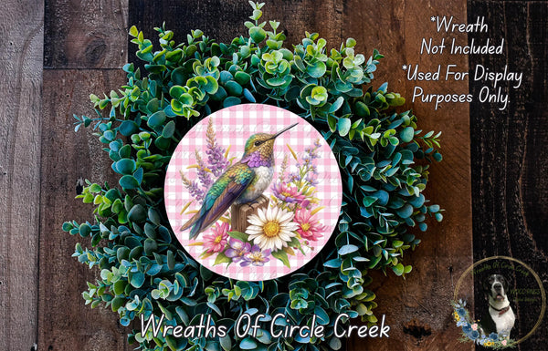 Spring Hummingbird Floral Sign | Pink Gingham Decor | Lightweight Round Metal Wreath Sign | No Holes in Sign | Summer Door Sign