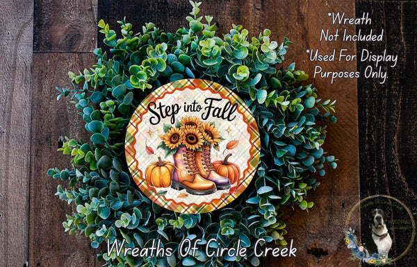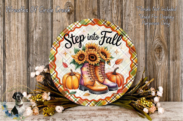 Step Into Fall | Sunflower Pumpkin Decor | Lightweight Round Metal Wreath Sign | No Holes in Sign | Autumn Plaid Fall Sign