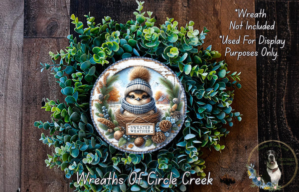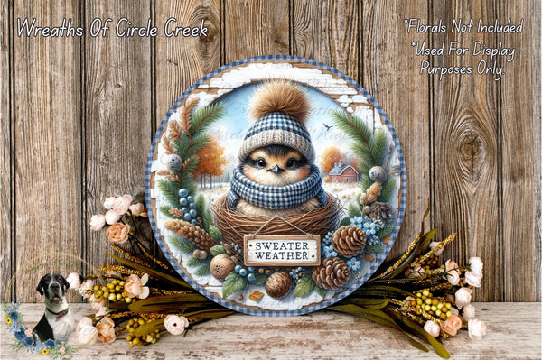 Sweater Weather Bird Sign | Lightweight Round Metal Wreath Sign | No Holes in Sign | Winter Farmhouse Decor