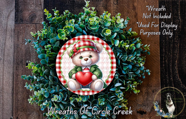 Sweet Teddy Bear | Red Gingham Love Decor | Lightweight Round Metal Wreath Sign | No Holes in Sign | Valentine