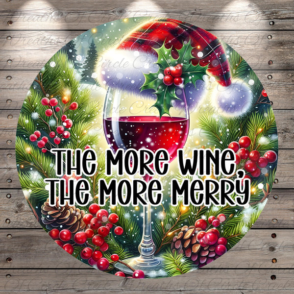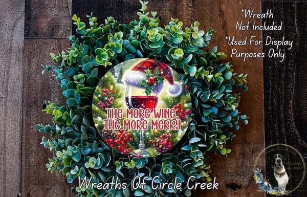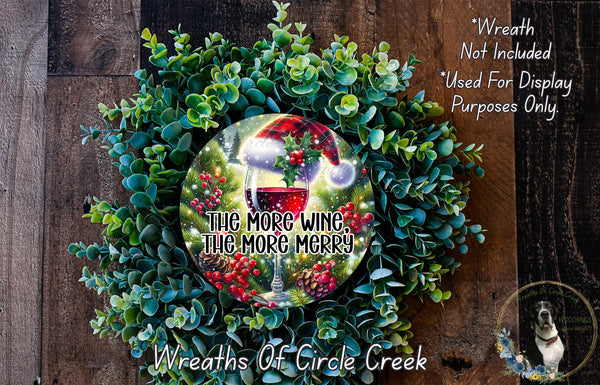 The More Wine The More Merry | Funny Christmas Wine Sign | Lightweight Round Metal Wreath Sign | No Holes in Sign | Holiday Party Decor