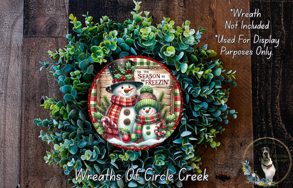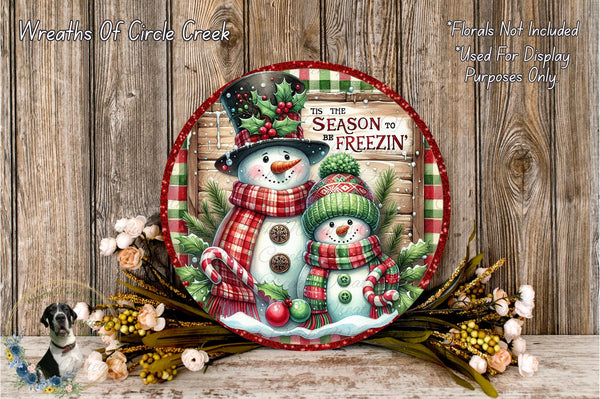 Tis the Season to Be Freezin | Cozy Snowman Winter Decor | Lightweight Round Metal Wreath Sign | No Holes in Sign | Christmas