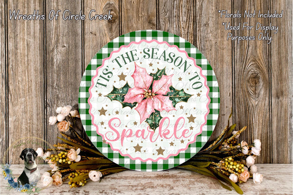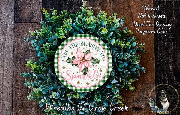 Tis the Season to Sparkle | Pink Poinsettia Christmas Decor | Lightweight Round Metal Wreath Sign | No Holes in Sign | Green Plaid Holiday