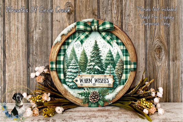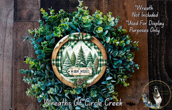 Warm Wishes Winter Forest | Lightweight Round Metal Wreath Sign | No Holes in Sign | Christmas Cabin Decor