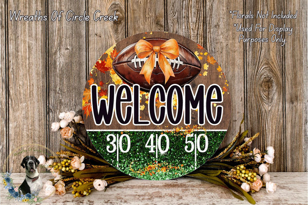 Welcome Fall Football | Autumn Sports Decor | Lightweight Round Metal Wreath Sign | No Holes in Sign | Game Day Welcome Sign