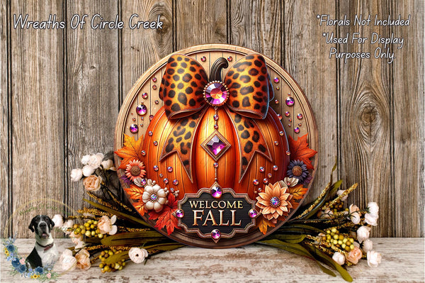 Welcome Fall Jewel Pumpkin Sign | Lightweight Round Metal Wreath Sign | No Holes in Sign | Glam Leopard Bow Decor