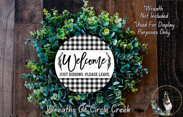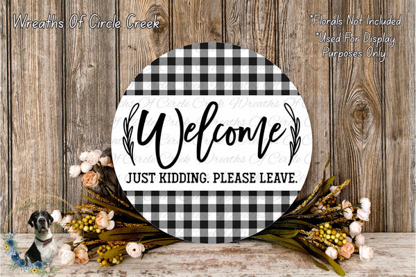 Welcome Just Kidding Please Leave | Black White Buffalo Check | Lightweight Round Metal Wreath Sign | No Holes in Sign | Funny Farmhouse
