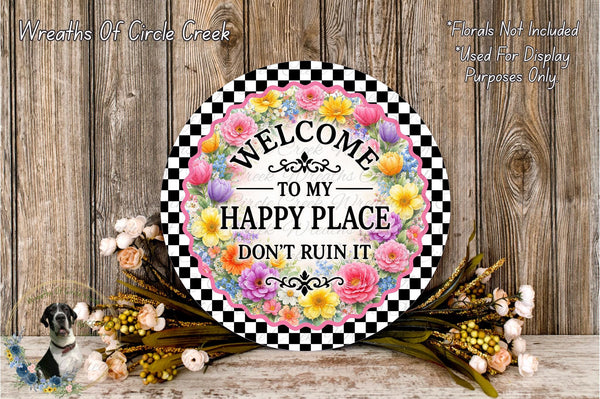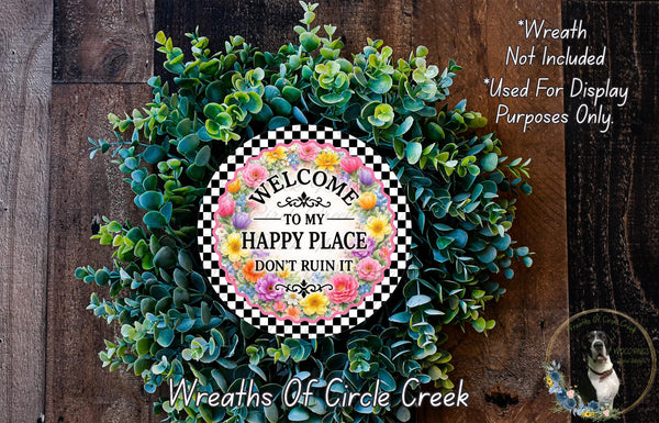 Welcome To My Happy Place Don’t Ruin It Floral Aluminum Metal Wreath Sign (Lightweight, No Holes)