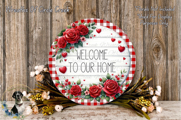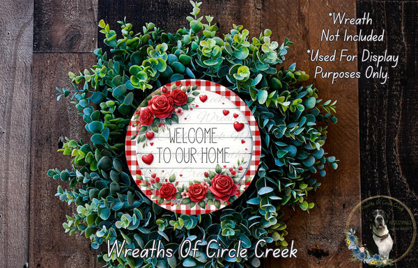 Welcome to Our Home Sign | Red Rose Valentine Decor | Lightweight Round Metal Wreath Sign | No Holes in Sign | Farmhouse Front Door Sign